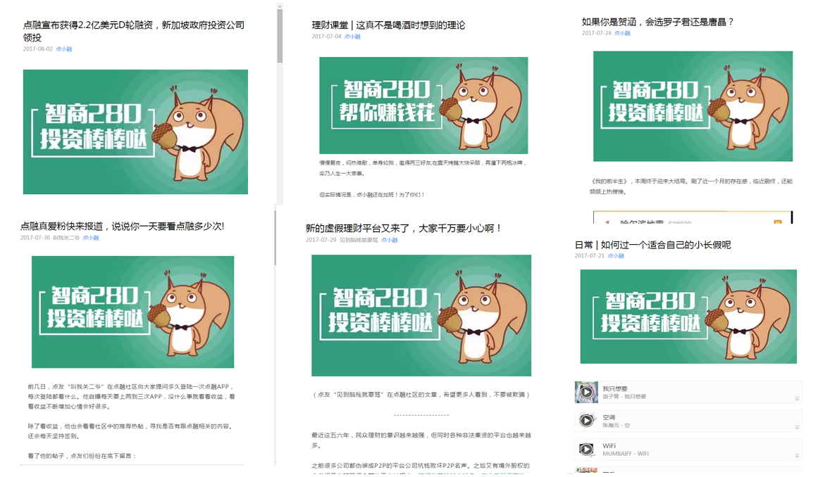 点融网是目前国内排名前五的P2P金融科技企业,为了提升品牌形象,增强点融网与消费者的有效沟通,晨岸传媒为其策划并打造个性化IP账号“点小融”。打造点小融双微账号,运营内容包括:理财课堂,分享实用知识;紧追热点,用原创文案带出相关理财产品、营销活动或品牌理念;制作创意漫画,通过“点小融”日常生活植入品牌个性。